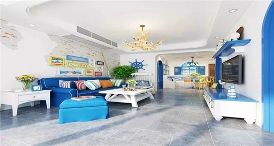 地中海民族風(fēng)的客廳裝修,家具都是白色的,搭配藍白的軟裝,搶眼的沙發(fā)墻是夢幻的星空,仿古的燈具與風(fēng)扇,色彩絢麗的同時透露出驚人的簡潔。不用說了,設(shè)計師很厲害。