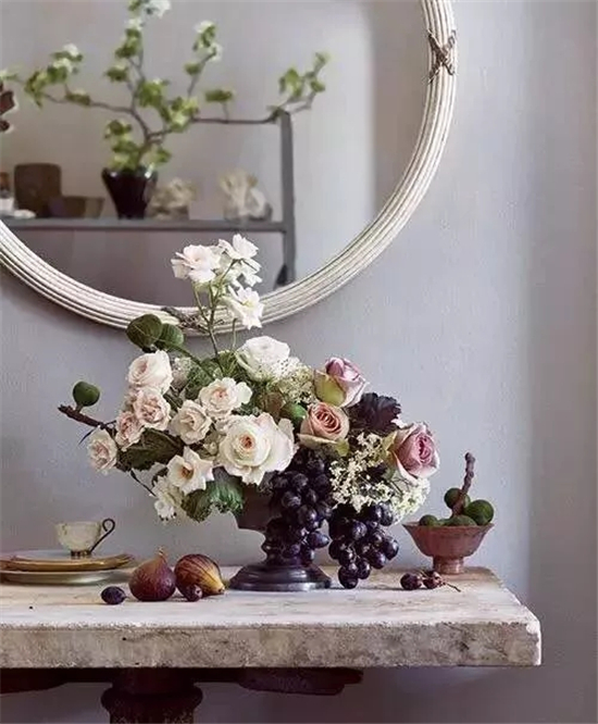 室內布置花藝除了有常見的落地布置之外,也可以與家具、陳設、燈具等物品進行結合,形成相互呼應的搭配整體。
