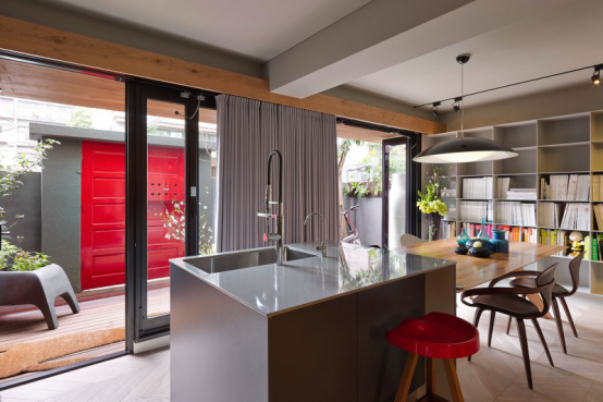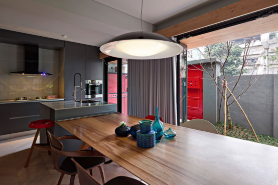 藍(lán)色花瓶、紅色座椅、淺灰色的吊燈也讓家變得跳動(dòng)起來(lái)了。