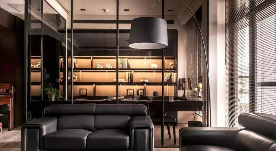 ③整體顏色搭配和衣柜、書桌、床等家具風格統(tǒng)一,營造出一個沉穩(wěn)大氣的客廳書房2合1空間。